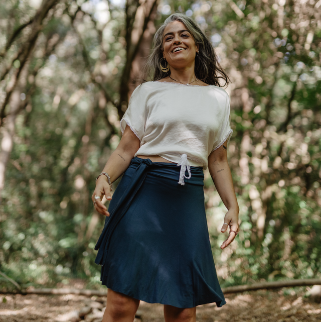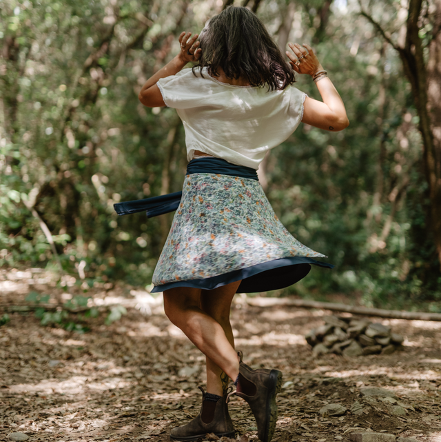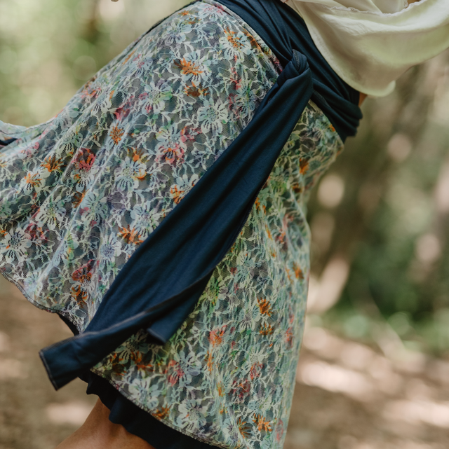 Falda reversible combinada . Un lado liso azul de viscosa elástica y el otro una blonda super linda de flores vintage de colores vivos. Pieza super multifuncion pues que aparte de falda también se puede utilizar como kimono capita o camisetita de un hombro. Me encanta que la prenda también te dé la oportunidad de crear a tu manera