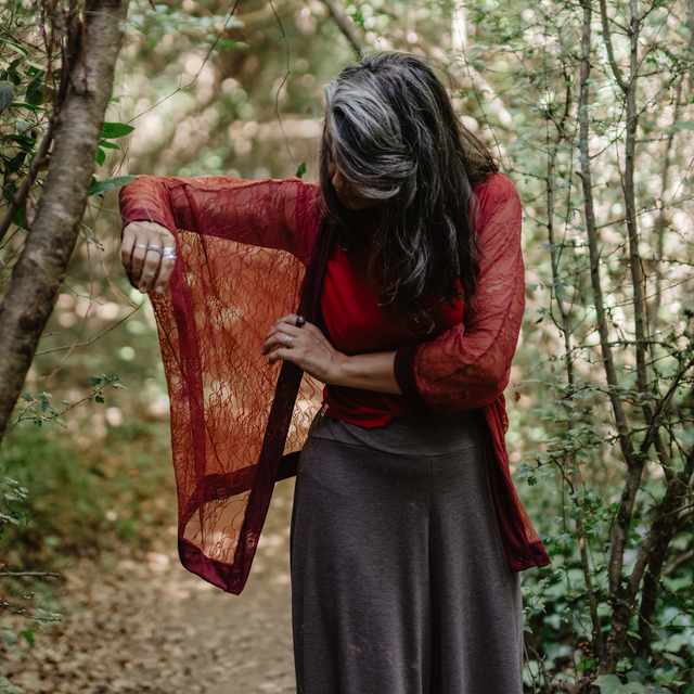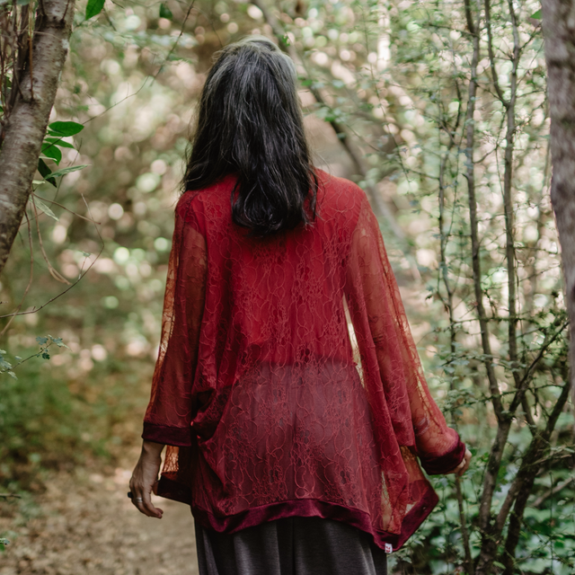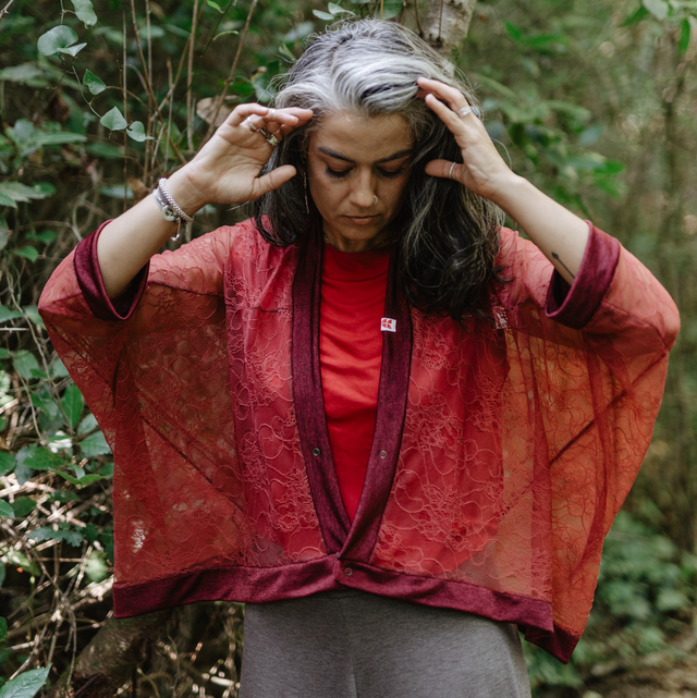 Kimono multifuncion de tela de blonda fina roja super linda con dibujos de flores vintage.