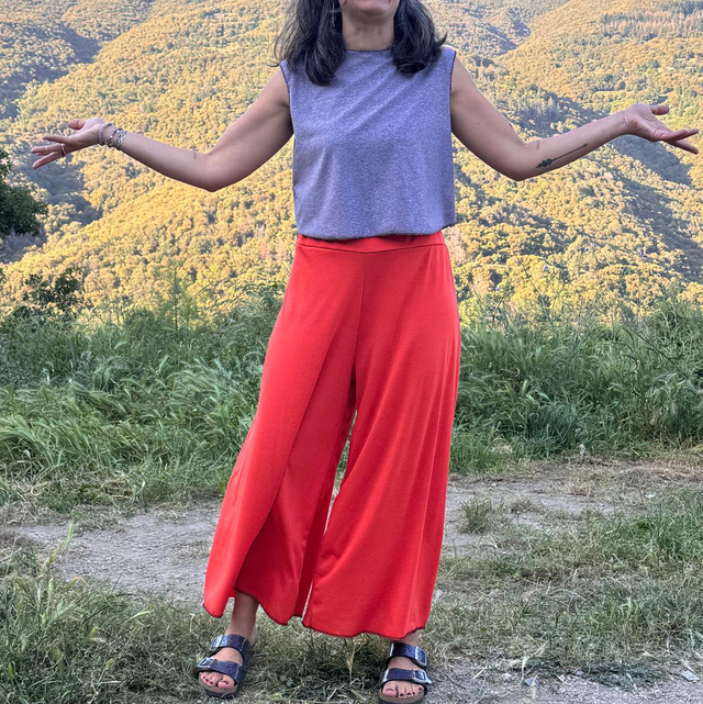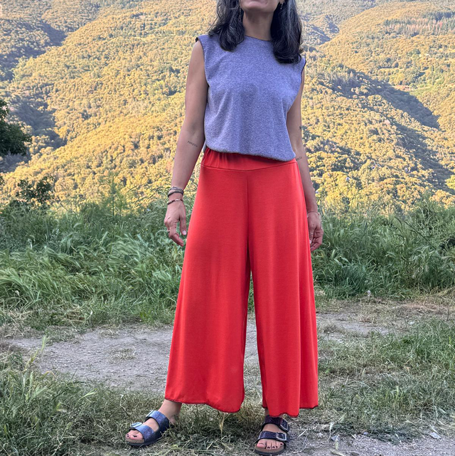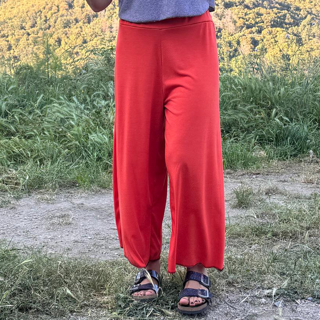 Pantalón que quería ser falda. Cintura elástica que se adapta muy bien para diferentes tallas . Que puede ser desdel 38 hasta un 42.
